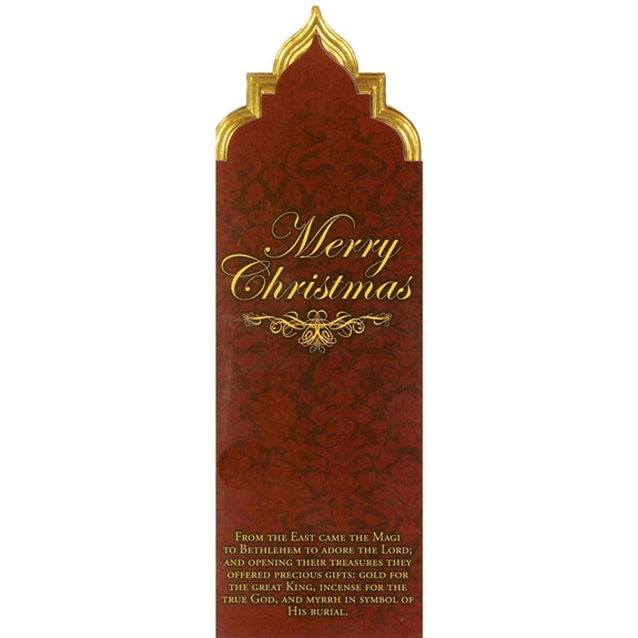 Front: Merry Christmas. From the East came the Magi to Bethlehem to adore the Lord; and opening their treasures they offered precious gifts: gold for the great King, incense for the true God, and myrrh in symbol of His burial.