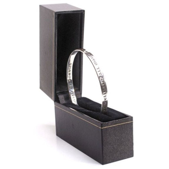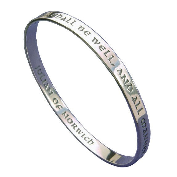 The famous prayer of Julian of Norwich "All shall be well, and all shall be well, and all manner of thing shall be well" stamped onto a silver bracelet. Considered one of the greatest English mystics, she lived as a hermit in the 14th century and was probably a Benedictine nun. Circular shape is 2-3/4" in diameter; band is 1/4" wide. Sterling silver, 1/2 ounce, made in USA. Includes attractive gift box and info card.