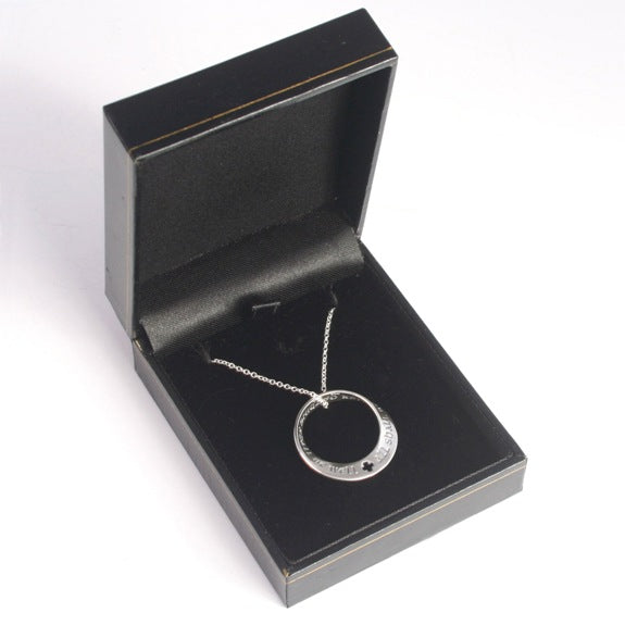 Medieval mystic Julian of Norwich's message of reassurance: "ALL SHALL BE WELL AND ALL SHALL BE WELL AND ALL MANNER OF THINGS SHALL BE WELL" is engraved in uncial script on this pendant. Simply decorated with a pierced cross, the 1" diameter pendant is shaped as a Möbius strip to symbolize infinity. Sterling silver, made in USA. Includes 18" chain, gift box and info card.