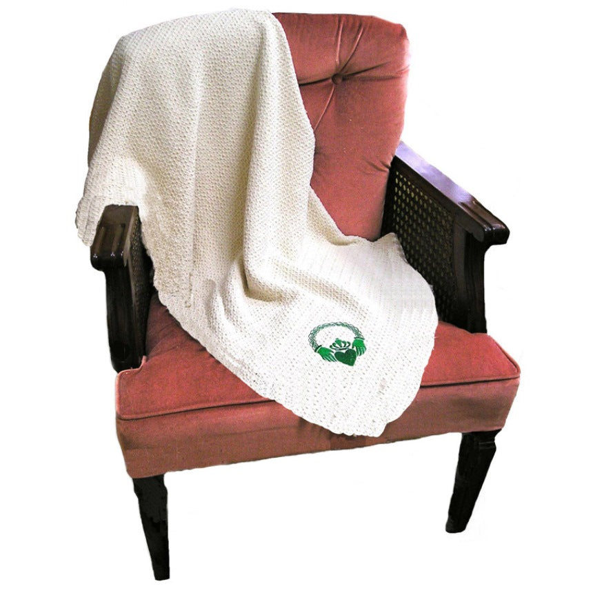 Hemmed, waffle-weave organic cotton blanket features embroidered green Claddagh symbol. The Claddagh ring is a traditional Irish ring given in friendship or worn as a wedding ring. The design and customs associated with it originated in the Irish fishing village of Claddagh, located just outside the old walls of the city of Galway.