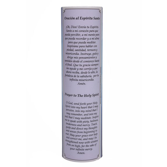 Features an image of the Holy Spirit depicted as a dove, and the legend "Espíritu Santo / Holy Spirit"; on the back is the "Prayer to the Holy Spirit" in English and Spanish.