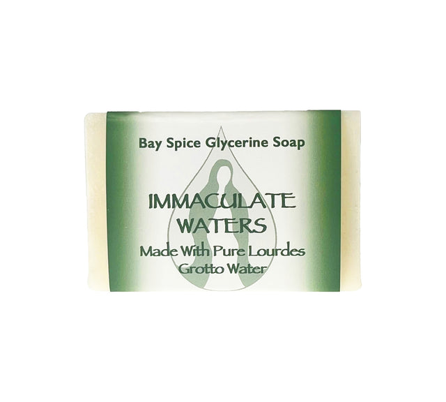 Bay Spice Bar Soap leaves skin feeling clean and moisturized. Made with coconut, palm & safflower oils, vegetable glycerin and Shea butter. Approximately 1/2 ounce of Lourdes Grotto water in each 4.2 ounce bar.