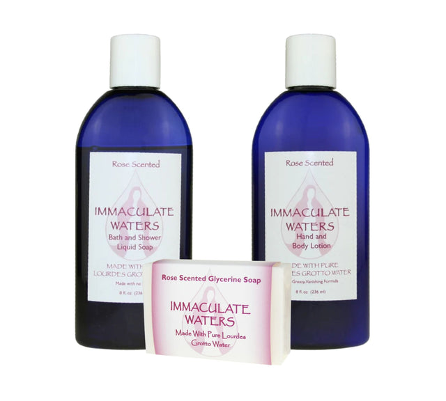Experience the blessing of Lourdes Grotto water in your daily care routine with this complete rose collection.