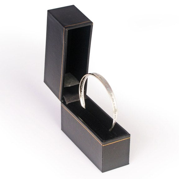 The 45-word Irish Blessing -- along with its beginning words in Gaelic -- all on a single bracelet. They all fit because they are stamped onto a Möbius strip, a circular "plane without end" having only one surface. Accepted as a sign for infinity, it is also an ideal symbol for prayer. Oval shape is 2 3/4" by 2 1/2" in diameter; band is 1/4" wide; fits up to an 8" wrist. Sterling silver, 1/2 ounce, made in USA. Includes attractive gift box and info card.