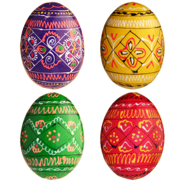 Because shipments from Ukraine have a wide assortment, eggs vary in color and design. Each set of four includes an informational flyer. Photos depict a sample set. Eggs are approximately 2.5" tall (1.75" in diameter).
