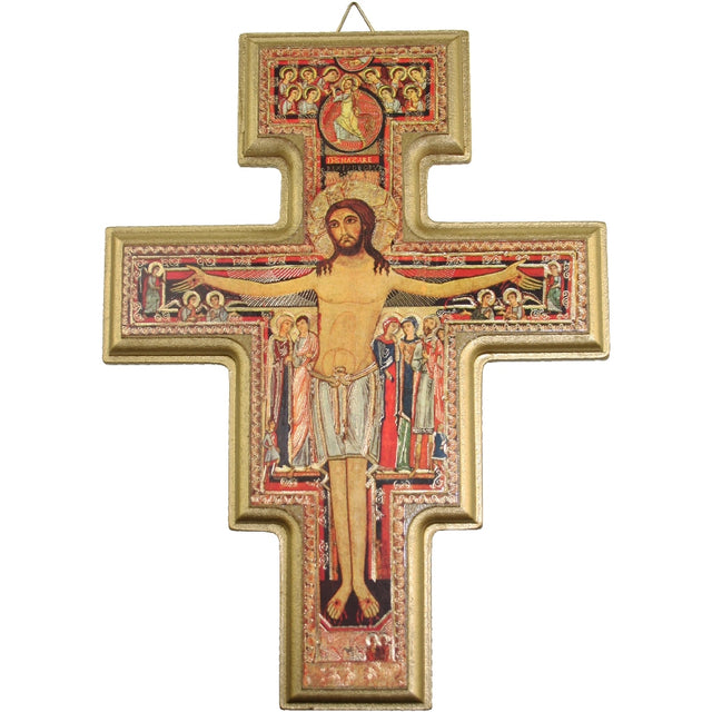 Perhaps the best-known and most highly venerated crucifix in the world. It hung in the abandoned Chapel of San Damiano where St. Francis (then young Francesco Bernardone) was called to the Lord's service. Made in Assisi. Mounted on durable wood board and finished with gold leaf, a raised gold frame and a hook for hanging. 8-1/2" x 6-1/2"