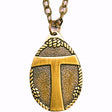 Bronze medal features a Tau Cross with a Franciscan cincture border; the three knots represent Poverty, Chastity and Obedience, the three cornerstones of the Franciscan Order. 1-1/4" x 7/8" oval medal on a 24" chain; gift boxed.