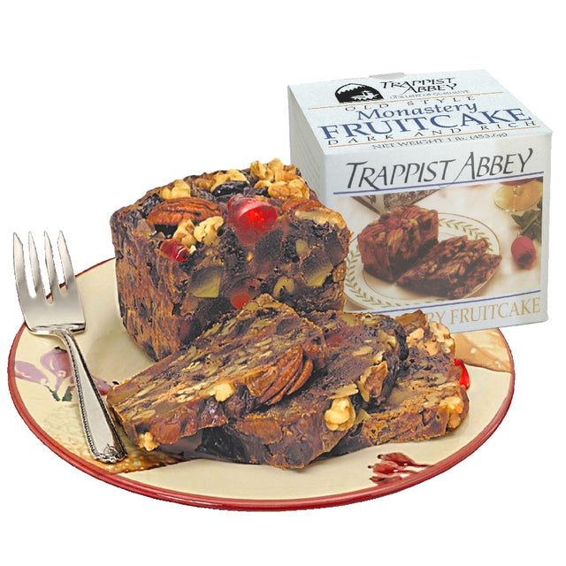 Old-fashioned, dark, rich, and moist fruitcake baked by Trappist monks using the finest ingredients – dried and candied pineapple and cherries, raisins, walnuts, pecans, and eggs. Lightly sweetened with honey and soaked in 120-proof brandy and aged to delicious perfection.